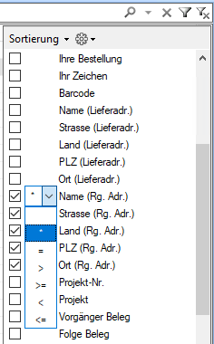 Klicken Sie in ihren Ansicht, rechts oberhalb der Spaltenbeschriftung auf den Pfeil neben dem Lupensymbol. Es klappt sich ein Fenster auf in dem sie die Datenfelder auswählen können, in der Ansicht sind das die Spalten. Markieren Sie z.B. die Spalte Name (Rg. Adr) für den Namen in der Rechnungsadresse damit in diesem Datenfeld gesucht werden kann. Rechts neben dem jeweiligen Haken können Sie die Logik angeben. mit der gesucht werden soll. Bei Textfeldern empfiehlt sicher der "Stern" auch Joker oder Platzhalter Zeichen genannt. Es ermöglich eine ungefähre Suche wobei ihr Suchtext an einer beliebigen Stelle im Datenfeld vorkommen darf.